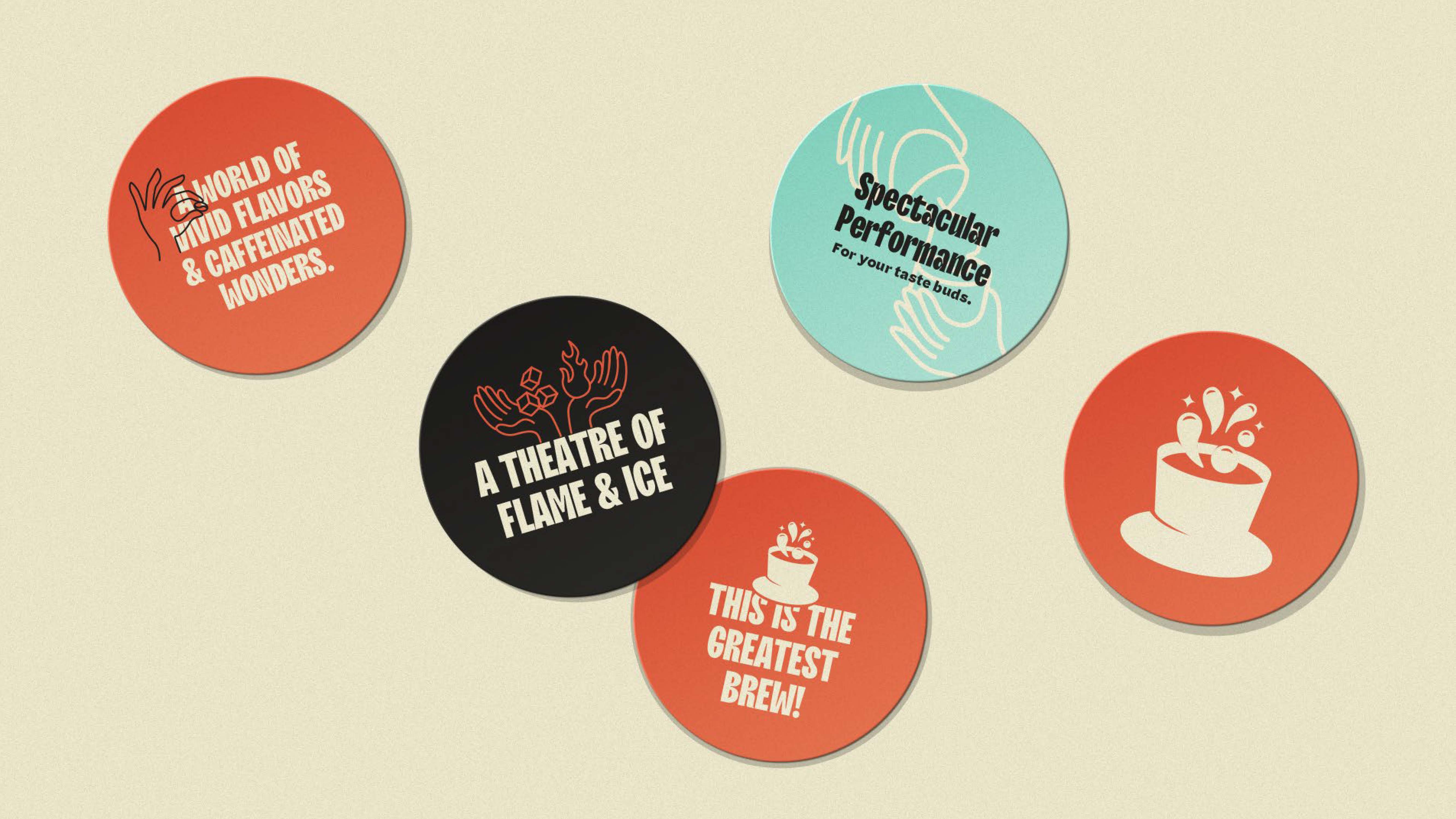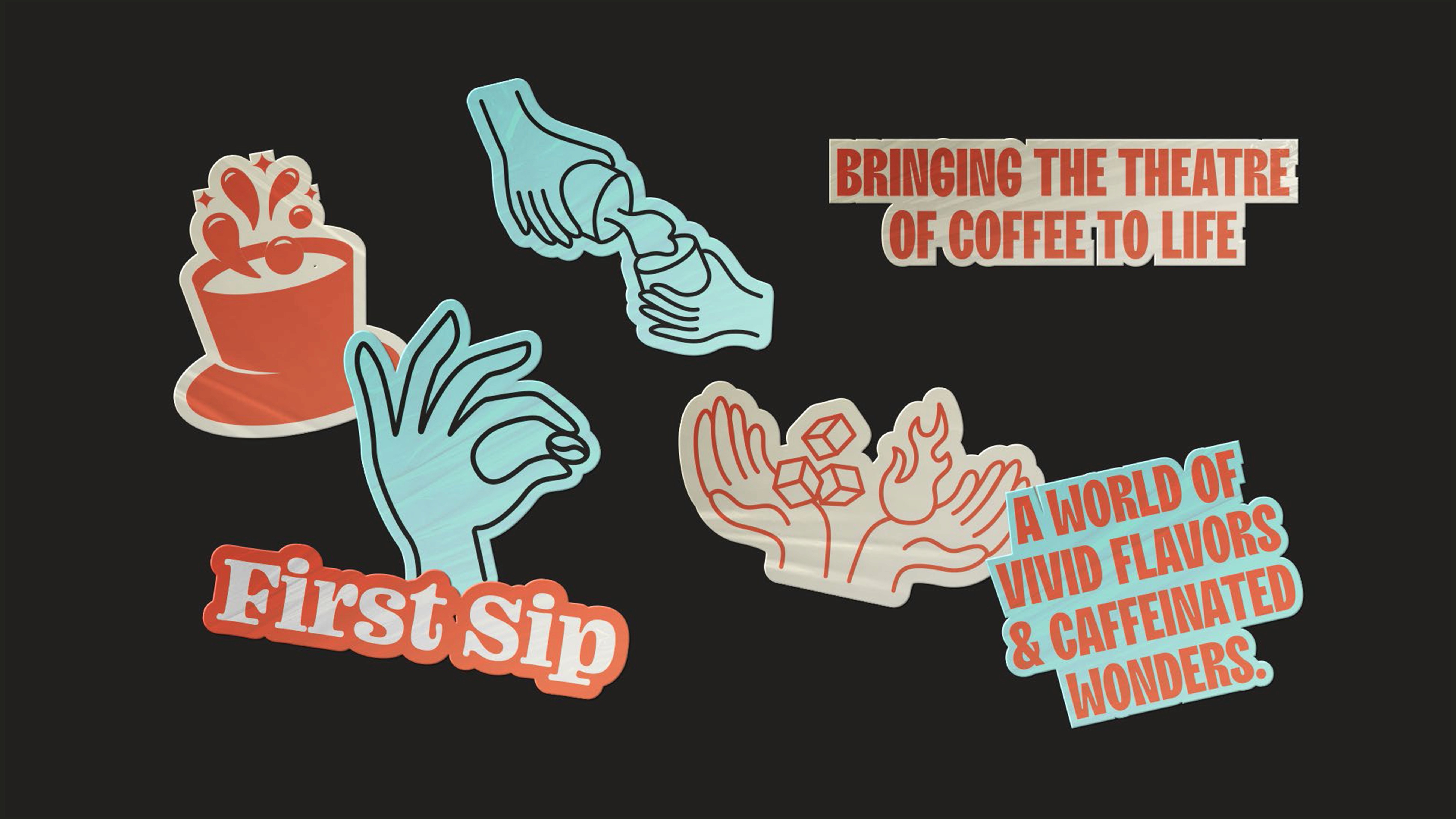 Theatre lives in the hands. The magician's reveal. The chef's flourish. The barista's pour. The illustration system was built from that logic: a set of hand gestures, each one mid-act, each one specific to what First Sip does. Flame and ice for the hot and cold bar. The perfect pinch for quality. The pour for craft.